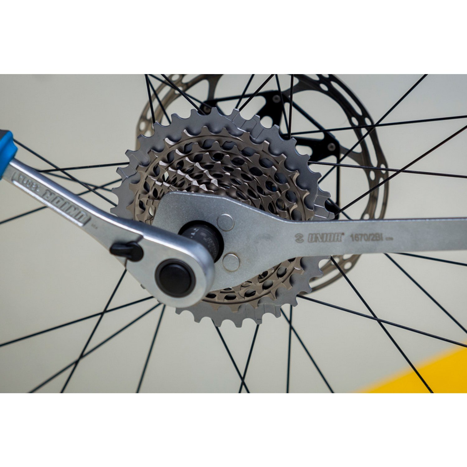 Штифты на инструменте входят в зацепление с самой маленькой звездочкой на кассете и удерживают ее на месте, в то время как отверстие в середине обеспечивает легкий доступ к стопорному кольцу кассеты.